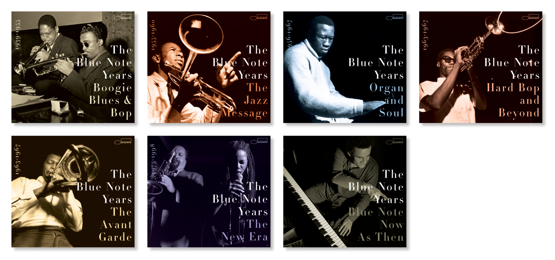 Structurally, there was an inherent division to the set which was the result of a dormant period between 1979, when EMI phased out the label in the face of falling jazz sales, and its relaunch in 1985. This was reflected in the picture book, split between Francis Wolff’s iconic photos and Jimmy Katz’s images for the new Blue Note. So to subtly suggest this difference, every image taken prior to 1979 was sepia tinted, and everything after 1985 was tinted blue.