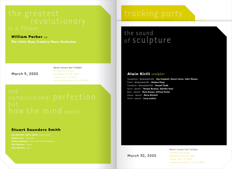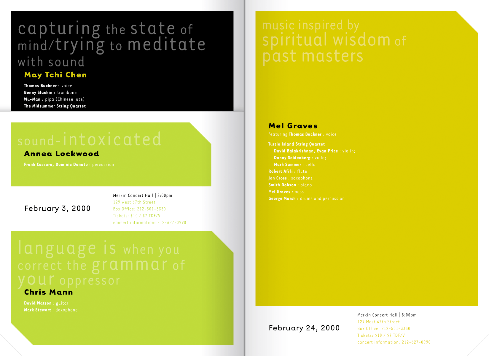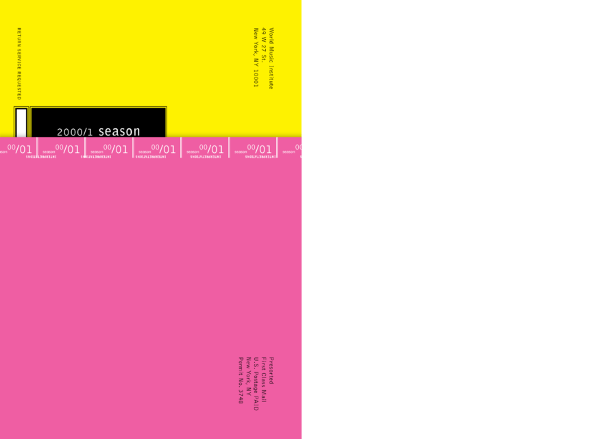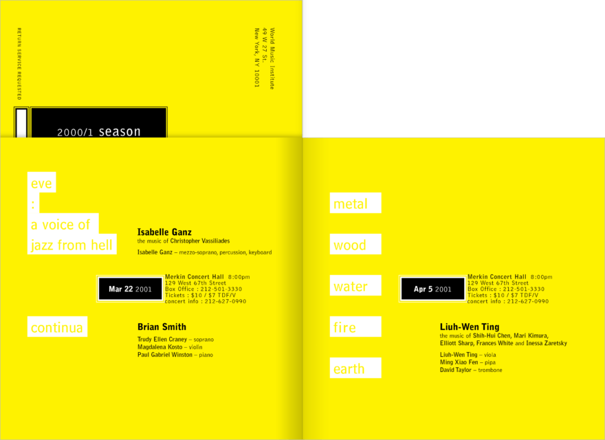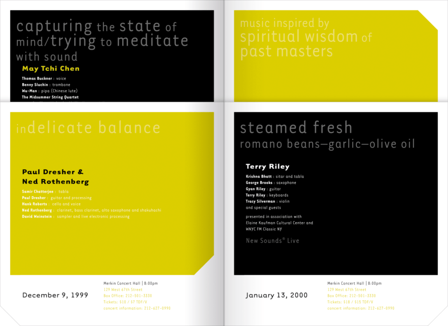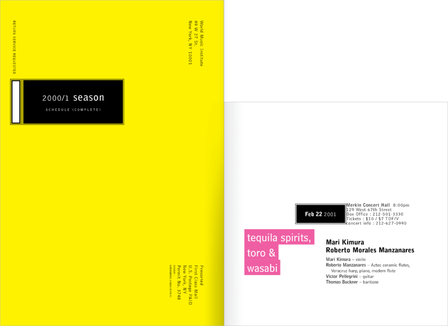 To suggest a mix of genres and styles, the 1999–2000 season’s brochure was made up of constantly-changing page sizes. The 2000–2001 brochure brought the outside to the inside and the inside to the outside. In other words, the outer cover appeared in the center, with the bulk of the text outside that — functioning as a half-cover.