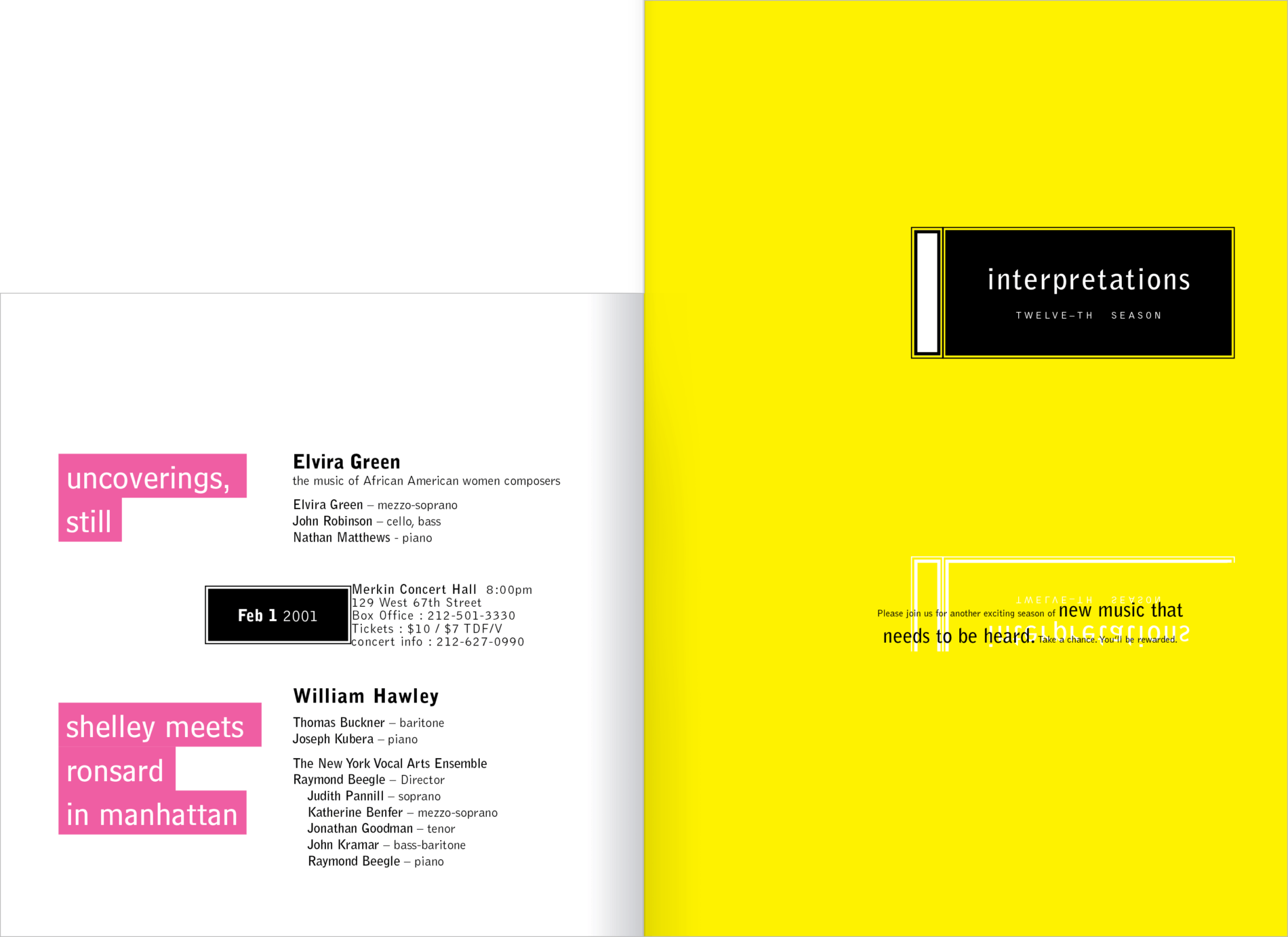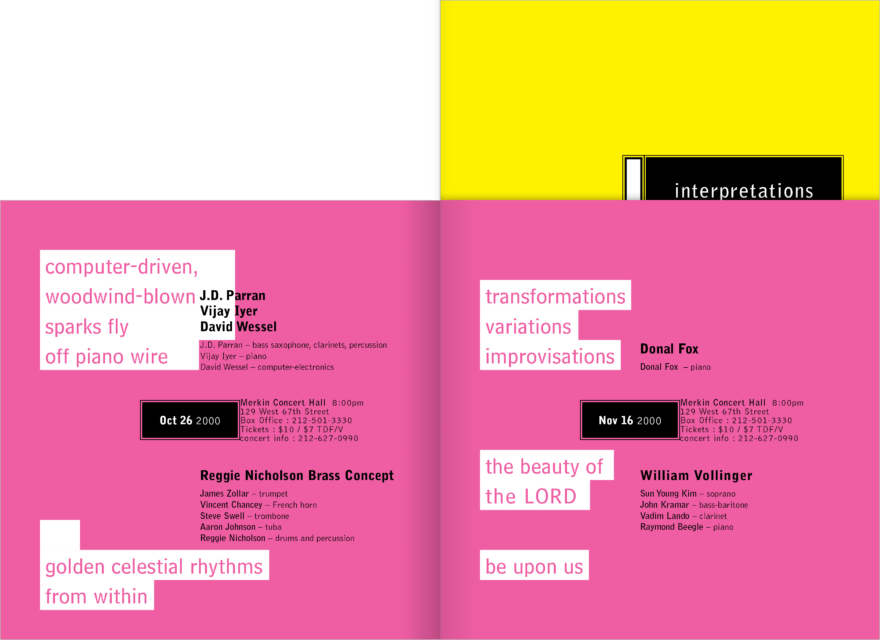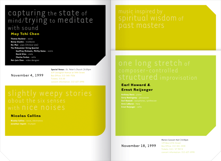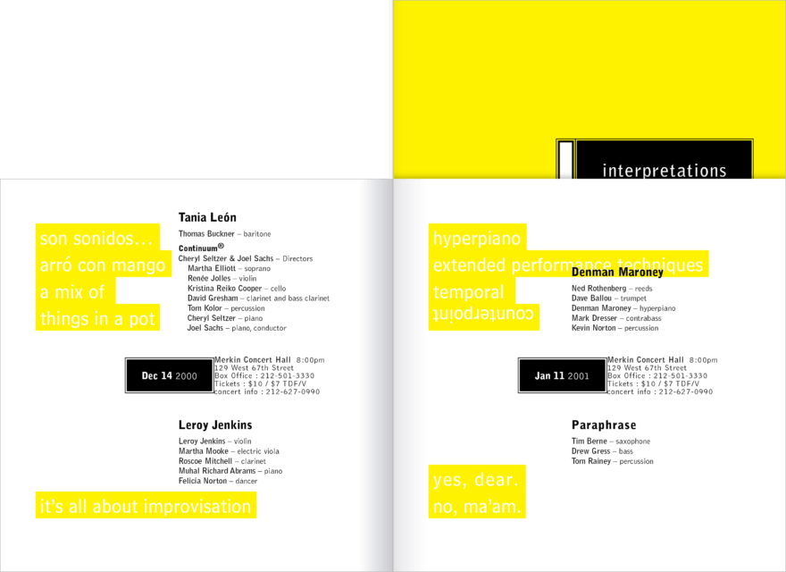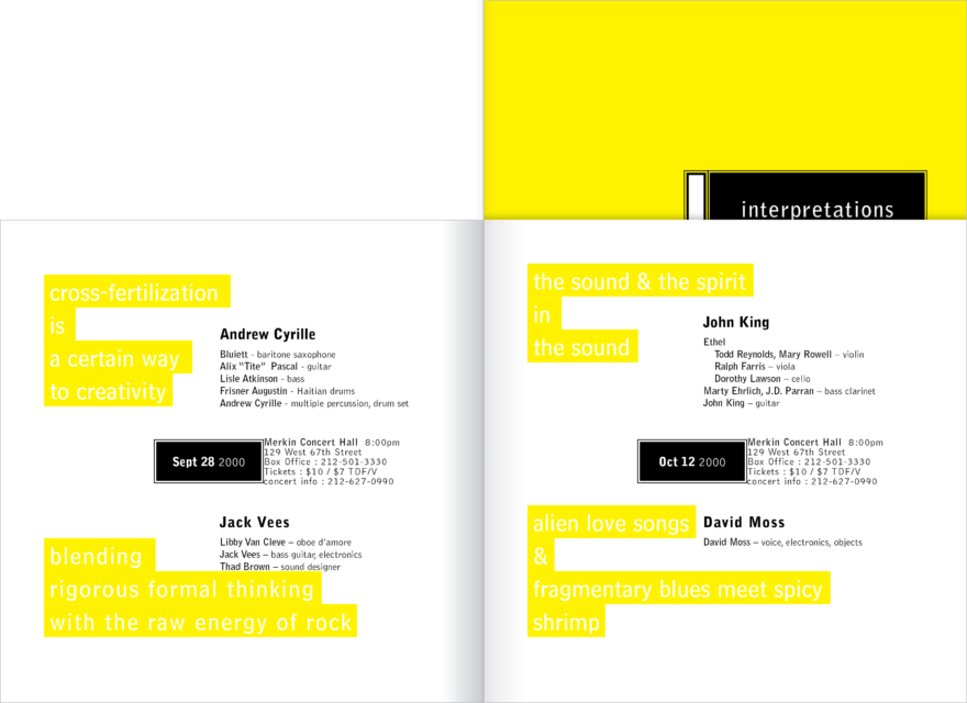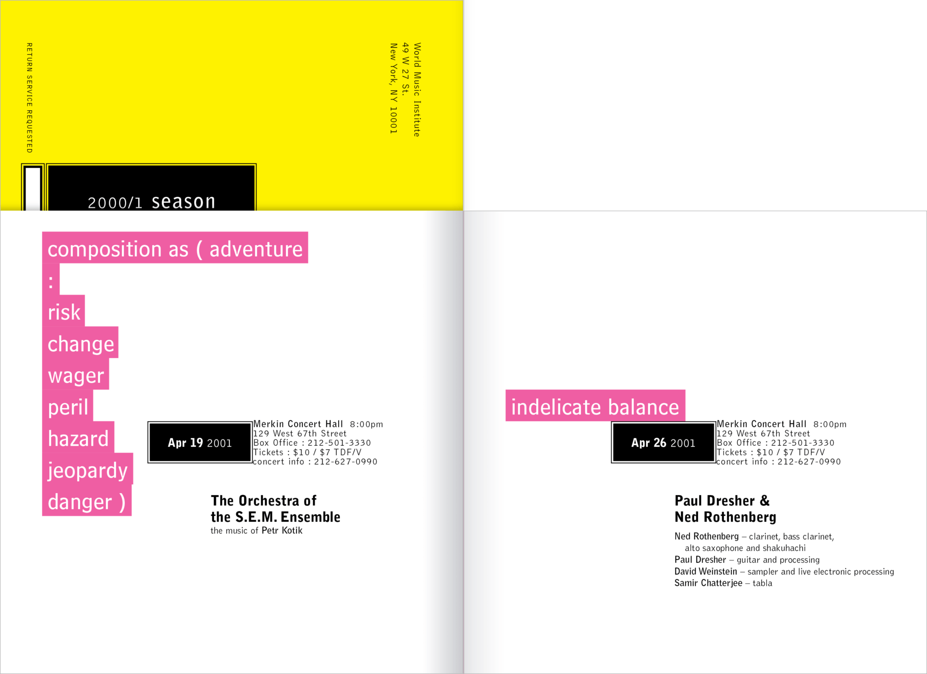 To suggest a mix of genres and styles, the 1999–2000 season’s brochure was made up of constantly-changing page sizes. The 2000–2001 brochure brought the outside to the inside and the inside to the outside. In other words, the outer cover appeared in the center, with the bulk of the text outside that — functioning as a half-cover.