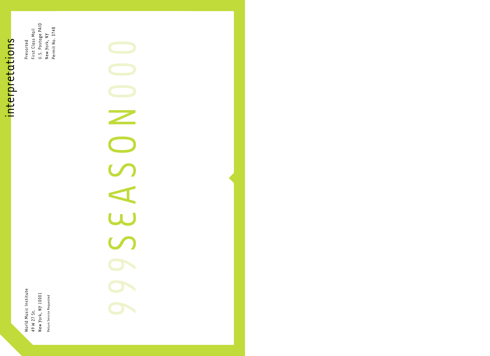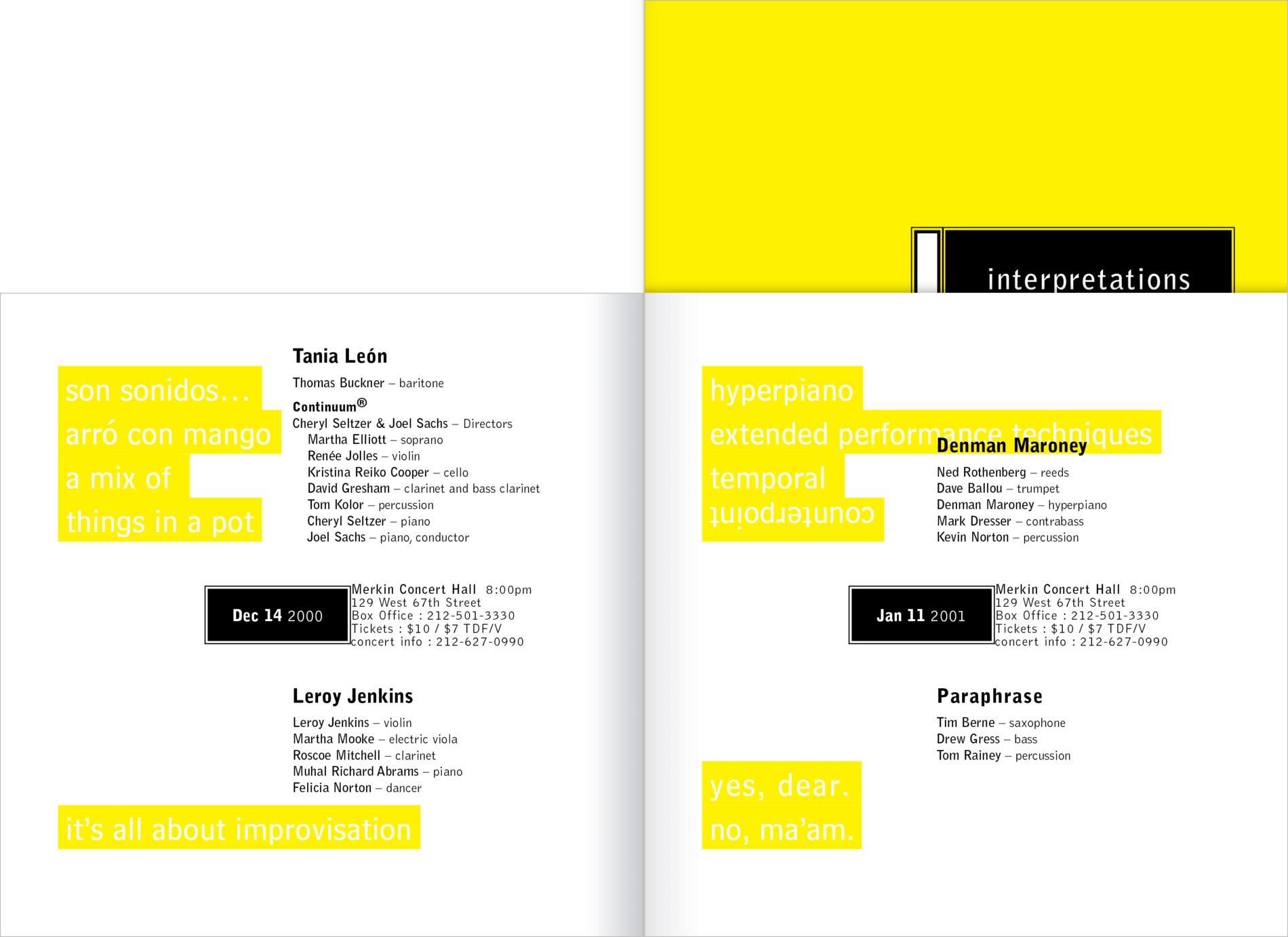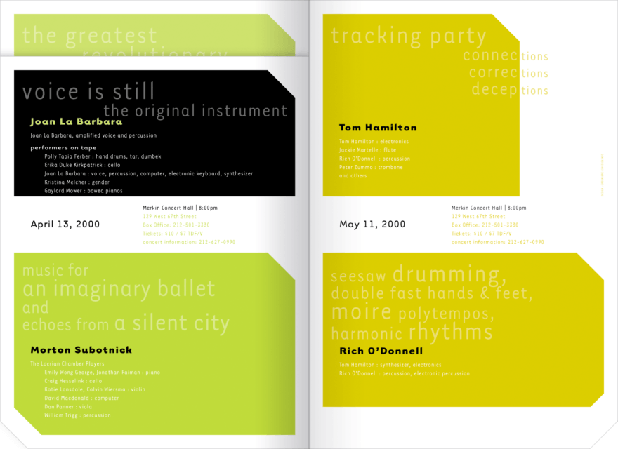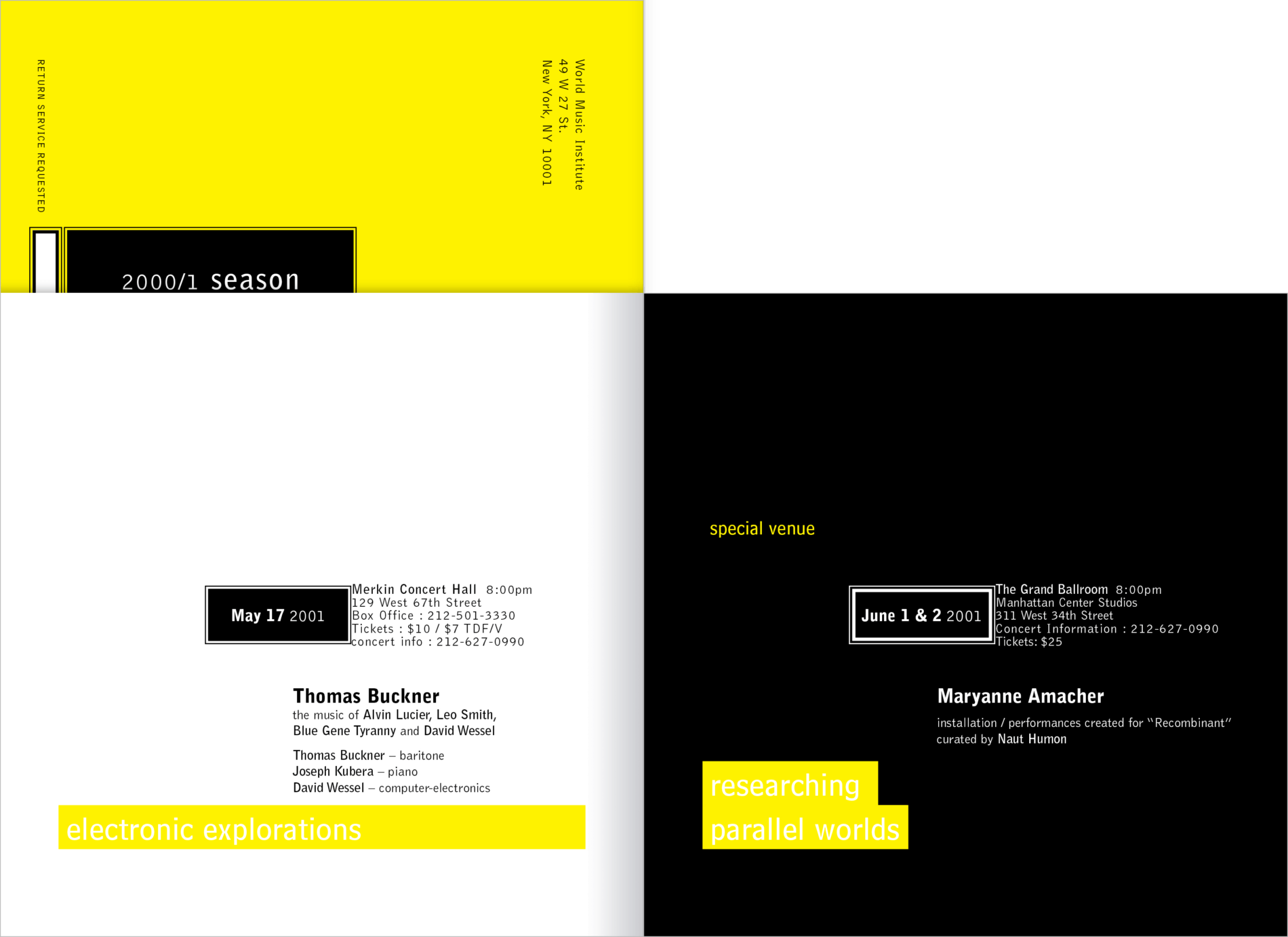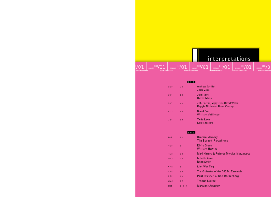 To suggest a mix of genres and styles, the 1999–2000 season’s brochure was made up of constantly-changing page sizes. The 2000–2001 brochure brought the outside to the inside and the inside to the outside. In other words, the outer cover appeared in the center, with the bulk of the text outside that — functioning as a half-cover.