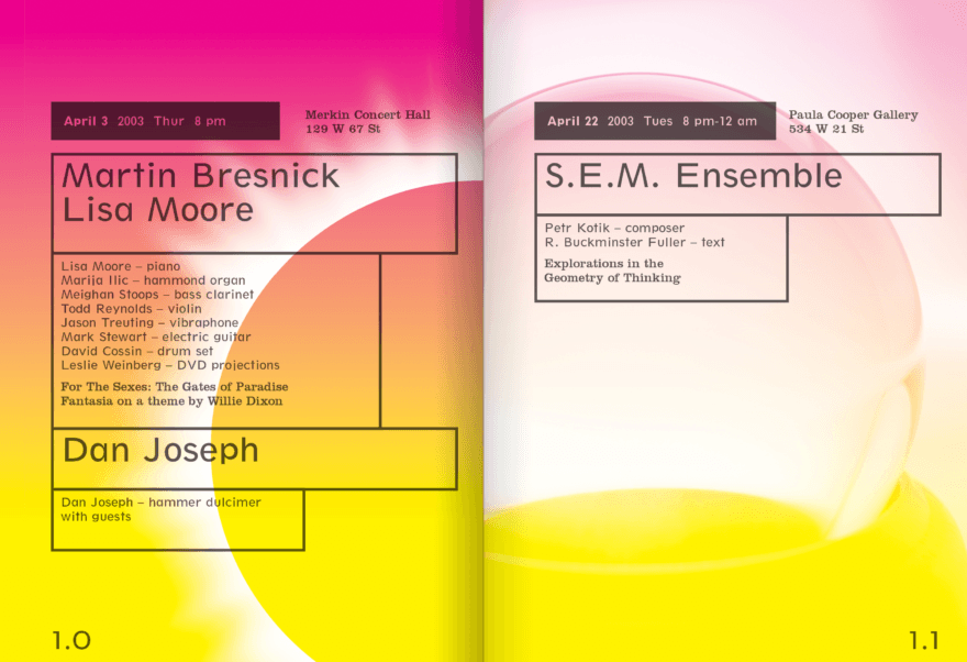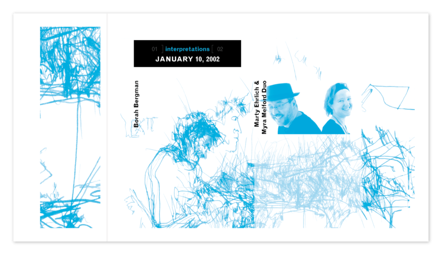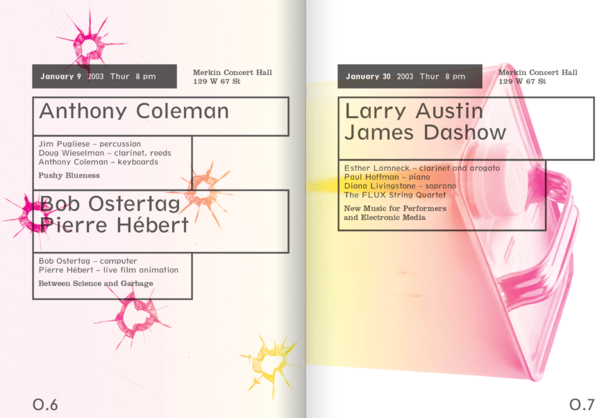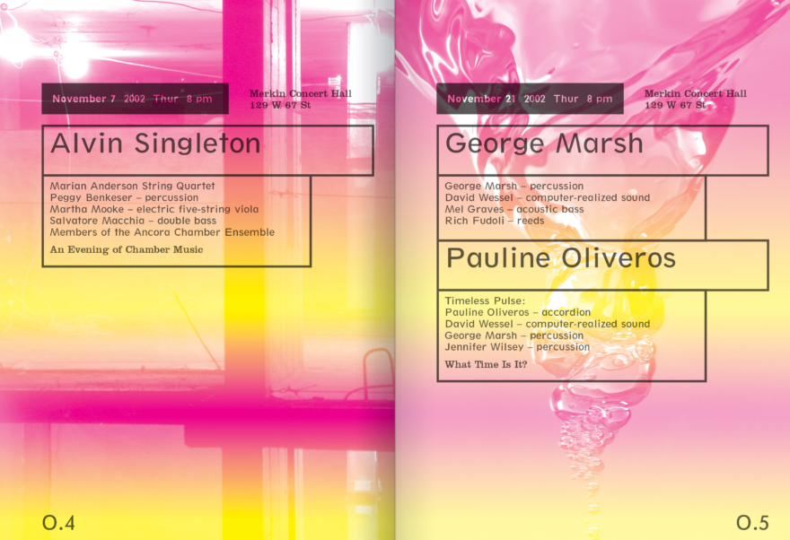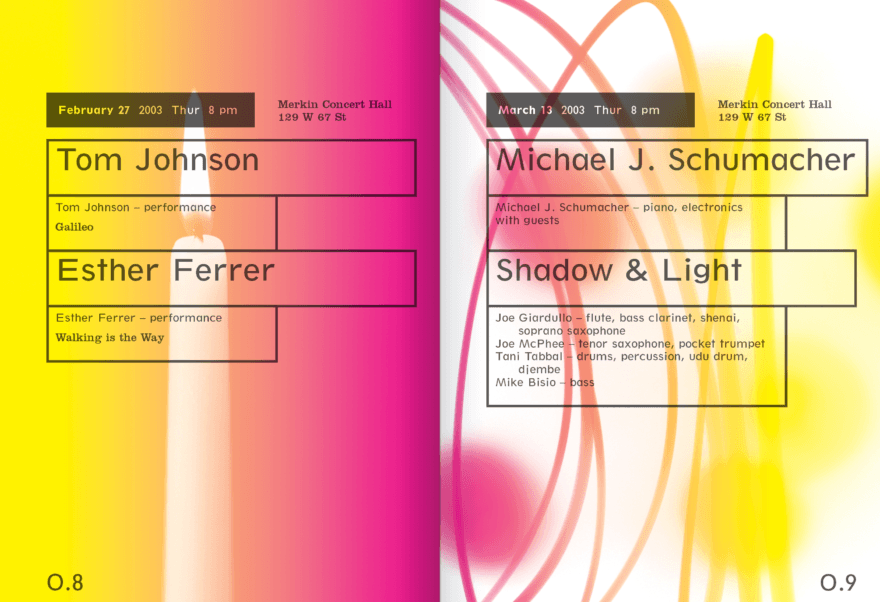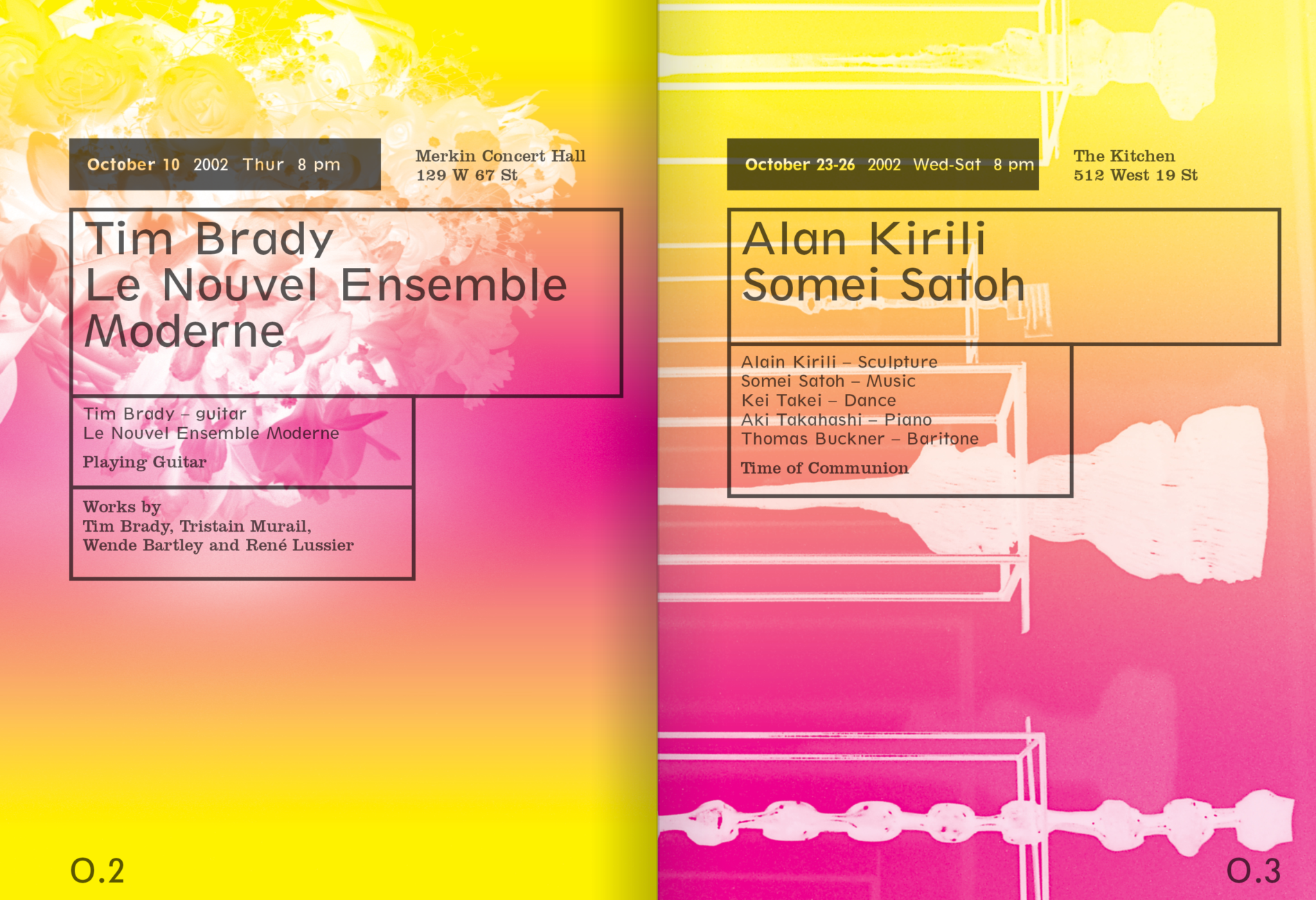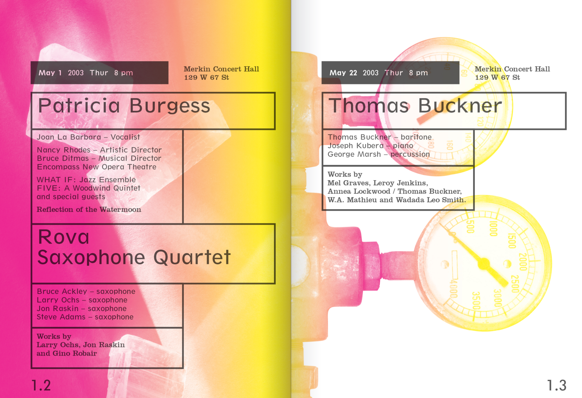 Since the music presented was often an exercise in acoustic phenomena, the 2002–2003 season was an exercise in the phenomena of ink. Images were printed in a split font — a printing technique where more than one color of ink shares an individual roller of the press. The two colors blend together and shift throughout the press run. And the text was surprinted in a cool grey color. Because printing inks on American offset presses are transparent, the split-font images were visible though the grey text.