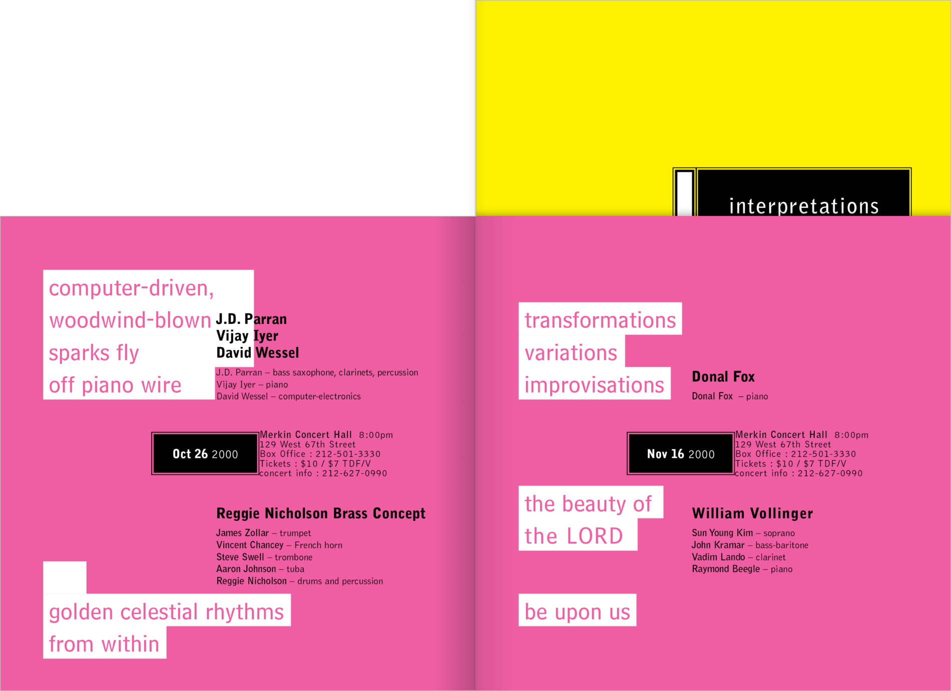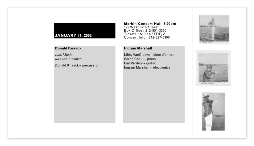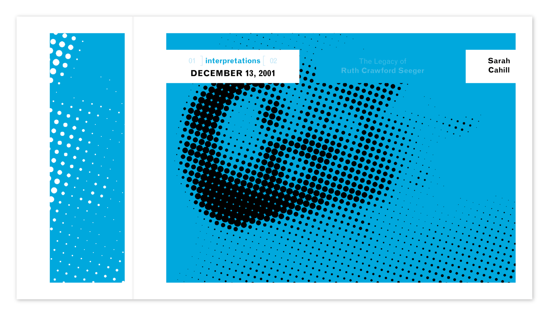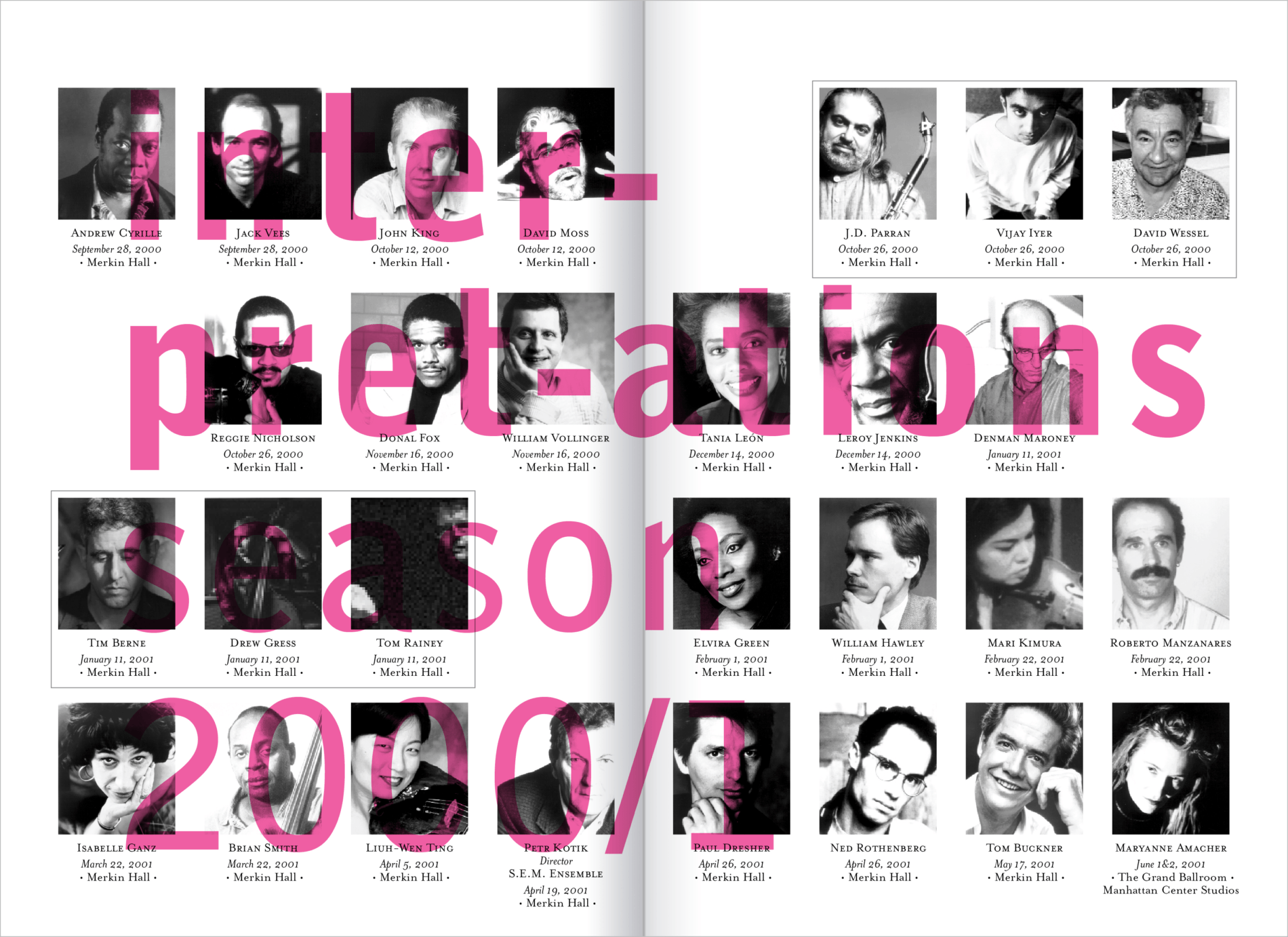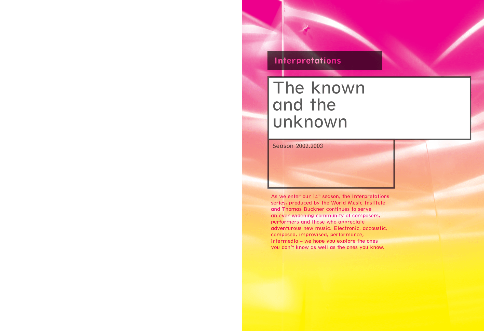Since the music presented was often an exercise in acoustic phenomena, the 2002–2003 season was an exercise in the phenomena of ink. Images were printed in a split font — a printing technique where more than one color of ink shares an individual roller of the press. The two colors blend together and shift throughout the press run. And the text was surprinted in a cool grey color. Because printing inks on American offset presses are transparent, the split-font images were visible though the grey text.