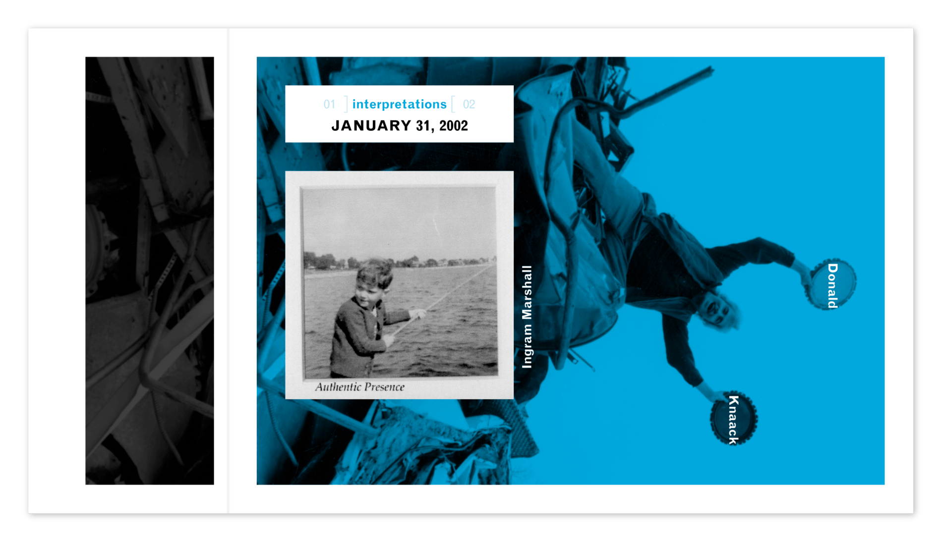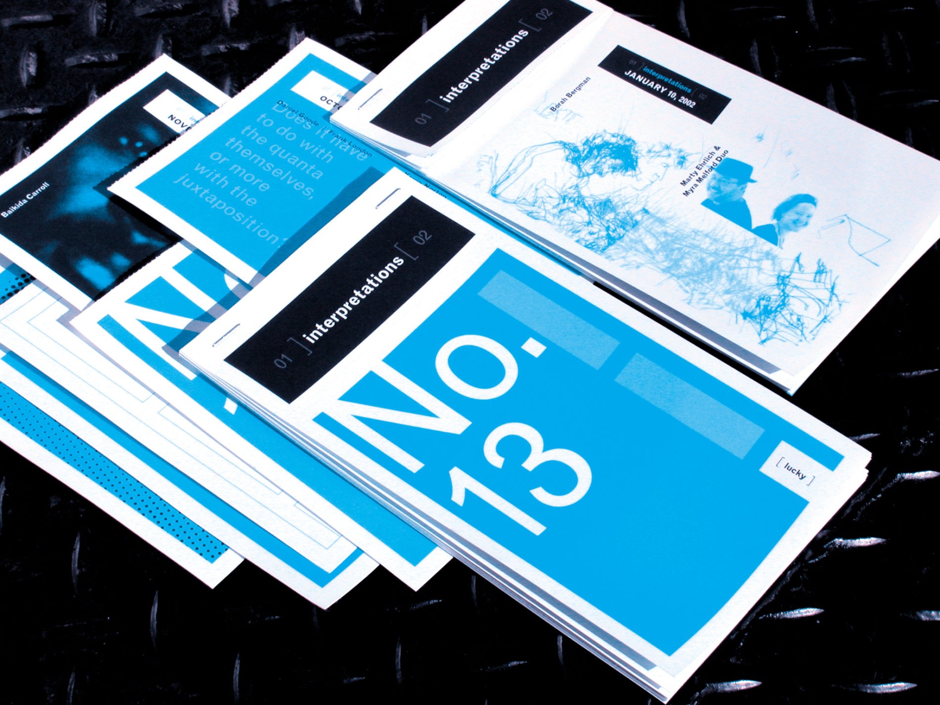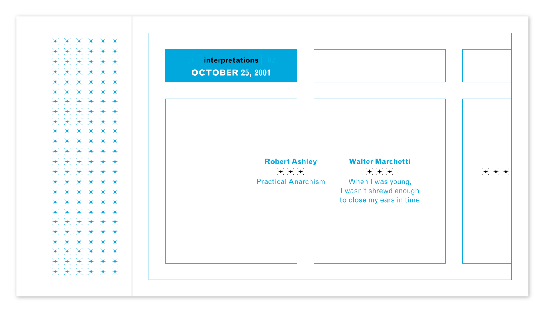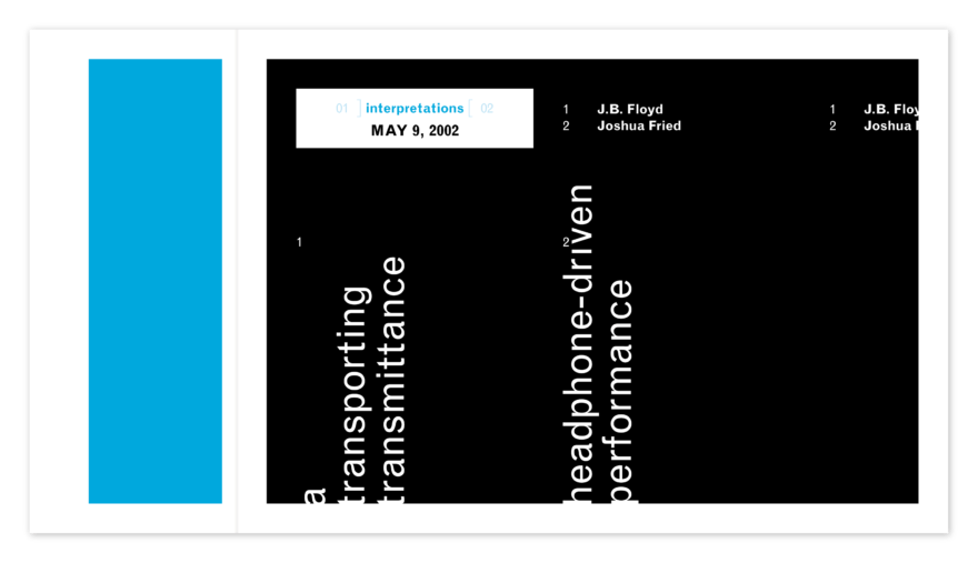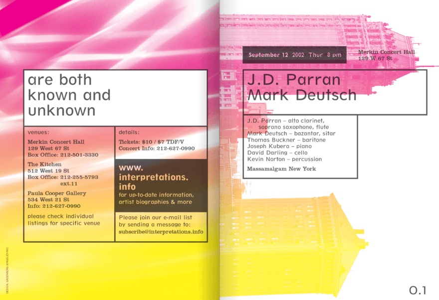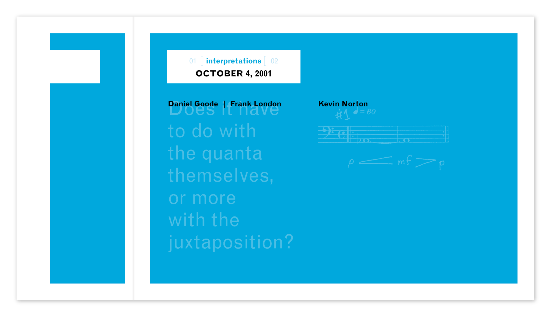Since the music presented was often an exercise in acoustic phenomena, the 2002–2003 season was an exercise in the phenomena of ink. Images were printed in a split font — a printing technique where more than one color of ink shares an individual roller of the press. The two colors blend together and shift throughout the press run. And the text was surprinted in a cool grey color. Because printing inks on American offset presses are transparent, the split-font images were visible though the grey text.
