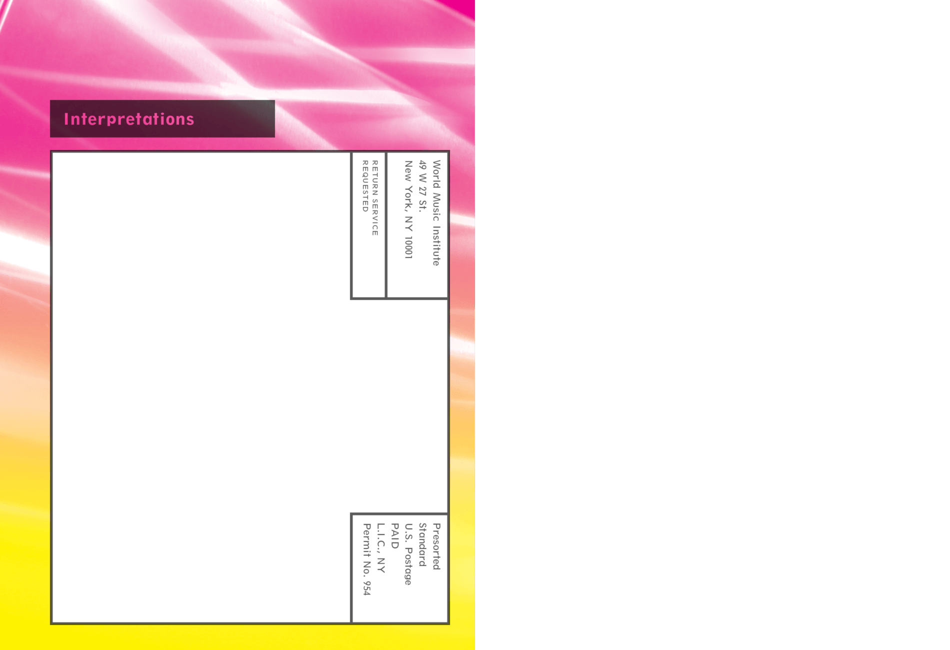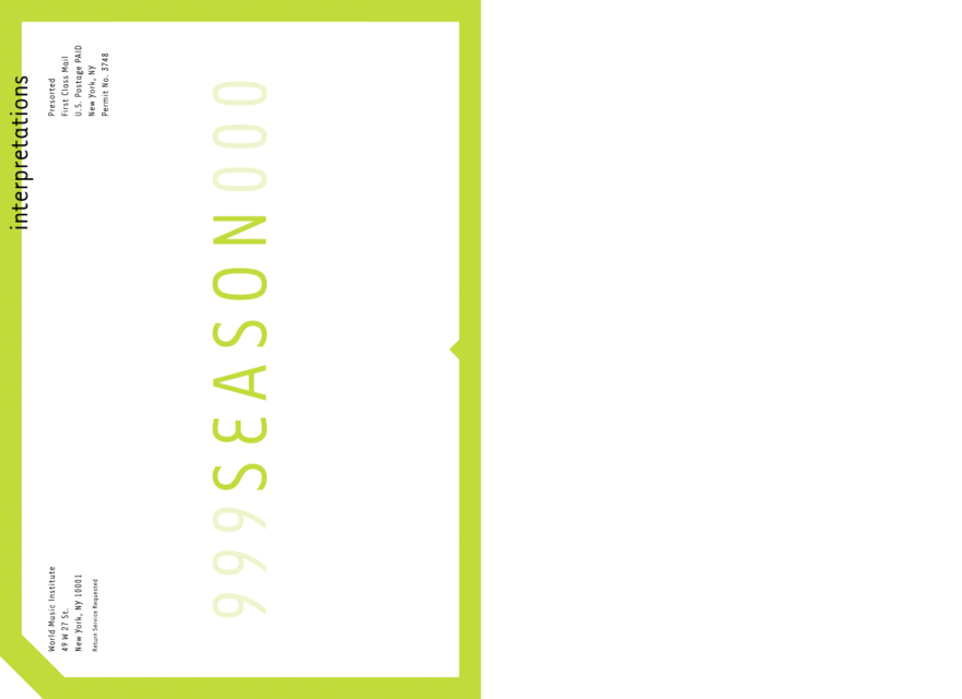 By the 2001–2002 season, a need for individual mailings for each concert was expressed. So we designed postcards for the whole season at beginning and bound them into a brochure. Each card was perforated for individual use.