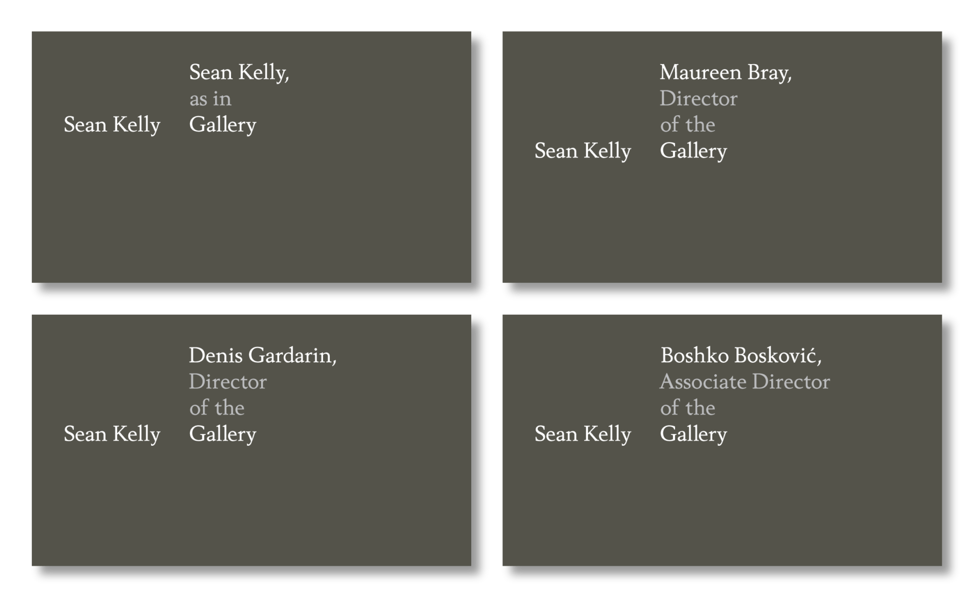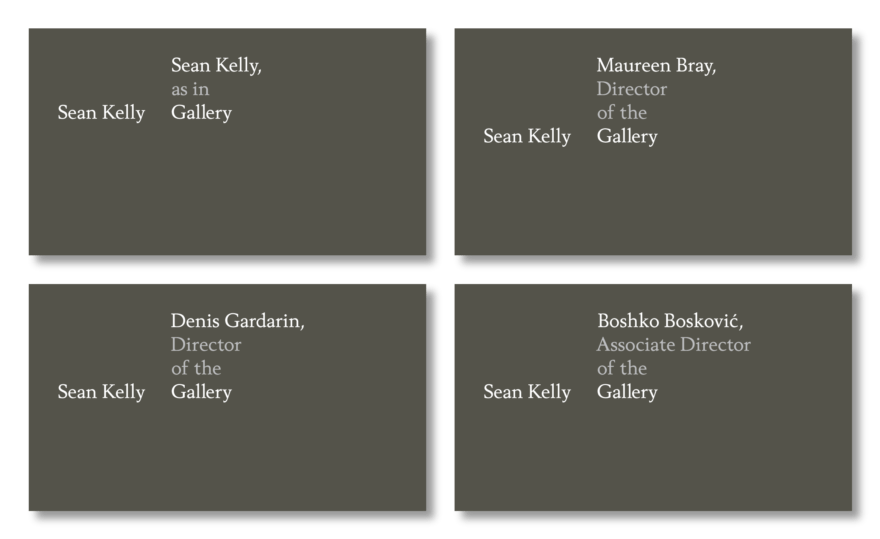 Therefore, the system needed to acknowledge both Sean Kelly’s and the gallery’s personality, and acknowledge their role as tastemaker and curator; as frame and stage.
